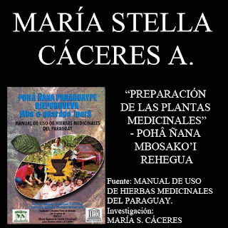Fuente: POHÂ ÑANA PARAGUAYPE OJEPORUVEVA - Mba’e guarâpa iporâ - MANUAL DE USO DE HIERBAS MEDICINALES DEL PARAGUAY. Proyecto Paraguay: Farmacopea Tradicional, Patrimonio Cultural y Estrategia de Desarrollo. Fundación Celestina Pérez de Almada. Con el apoyo de UNESCO - Oficina Regional de Ciencia y Tecnología para América Latina y el Caribe. Investigación y MARÍA STELLA CÁCERES A. Redacción: MARTA MACHAÍN SINGER Traducción Castellano/ Guaraní: Arnaldo Gutiérrez Acosta / Asesoría Científica: Dra. María Teresa Saenz Rodríguez - Dra. María Dolores Giménez. Facultad de Farmacia, Universidad de Sevilla, España. / Asesoría Dionisio Gauto / Lingüística: Indalecio Riquelme / Diseño Gráfico: María Stella Cáceres A. - Marta Machaín Singer.